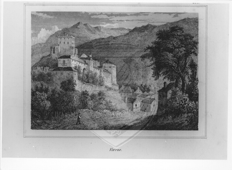 Paesaggio, Stampa raffigurante veduta di Verrès: il Castello, la Prevostura di Saint-Gilles e case del Borgo